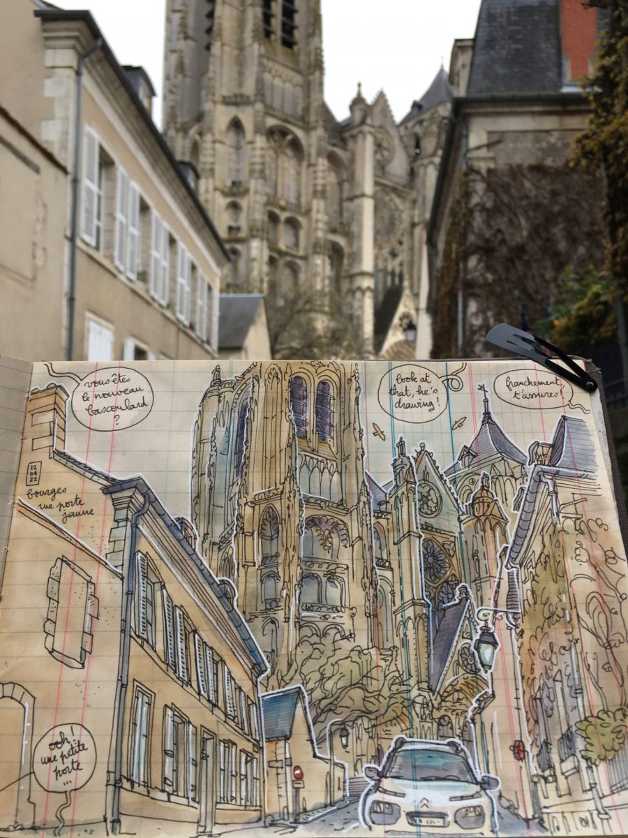 C’est un carnet d’environ 90-100 pages, consacré à Bourges (premier tirage à 2 000 exemplaires) sous ses différents aspects (histoire, culture, patrimoine, gastronomie ou encore le sport de haut niveau…) ! Les dessins retranscrivent et présentent les événements et sites marquants du territoire, les fiertés locales et les symboles de la ville… mais font aussi la part belle aux portraits et aux rencontres ! L’objet final est destiné aux locaux fiers de la mise en avant de leur ville, comme aux touristes ou aux expatriés curieux de (re)découvrir la Capitale du Berry…