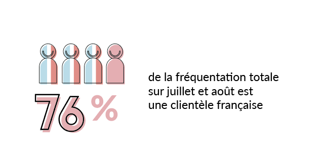 Sur juillet-août, la clientèle française représente 76 % de la fréquentation totale (75 % en 2022). Elle représente 72 % de la moyenne régionale.