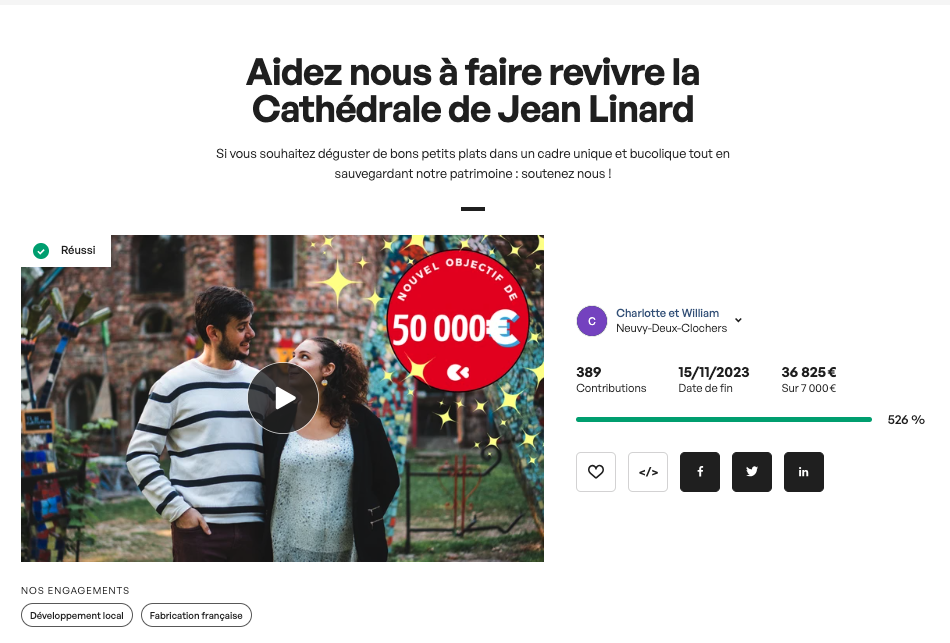 - Le projet « Aidez-nous à faire revivre la Cathédrale de Linard », porté par Charlotte et William, propriétaires du site a battu plusieurs records : celui du record de la plus importante cagnotte (36 825 €), du nombre de contributeurs (389) et pourcentage d’objectifs (526 %) de la collaboration entre Tourisme & Territoires du Cher mais aussi tout simplement à l’échelle des projets du Cher portés par la plateforme.