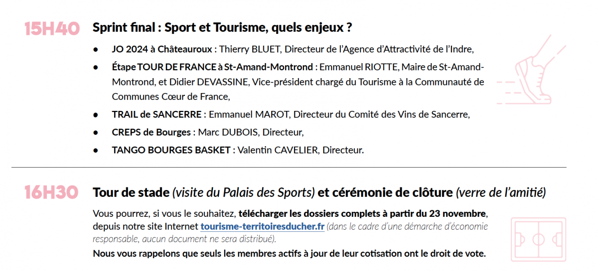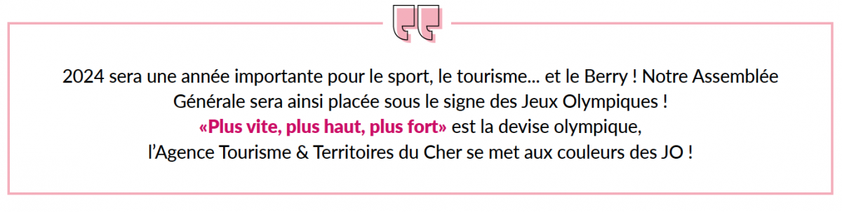 Tourisme & Territoires du Cher vous donne rendez-vous le jeudi 30 novembre, à partir de 14h au Palais des Sports du Prado, à Bourges, pour son Assemblée Générale annuelle. Elle sera cette année, placée sous le signe du sport.