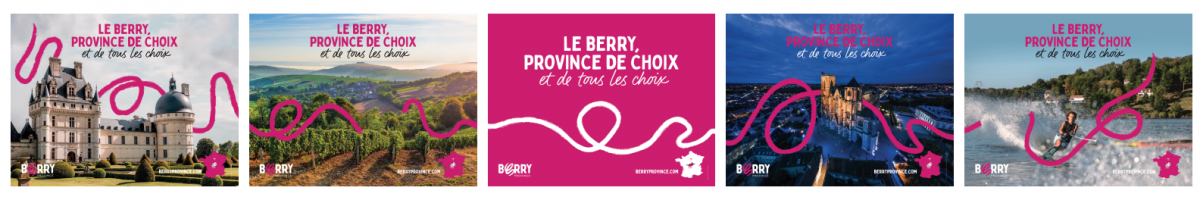 La campagne s’articule sur un effet “masse” avec cinq affiches en enfilade dans les couloirs du métro parisien. Une affiche d’accroche rose avec le slogan “Berry Province, province de choix et de tous les choix” est encadrée par les quatre visuels.