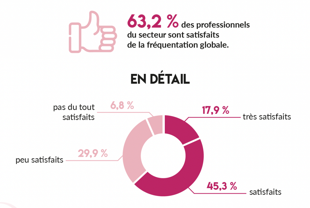 Alors que 71 % d’entre eux estimaient satisfaisante voire très satisfaisante la fréquentation de leur établissement en juillet et août 2023, ce chiffre recule légèrement en juillet et août 2024 et tombe à 63,2 %. Près de 2/3 des professionnels du secteur restent donc satisfaits de la saison estivale 2024.