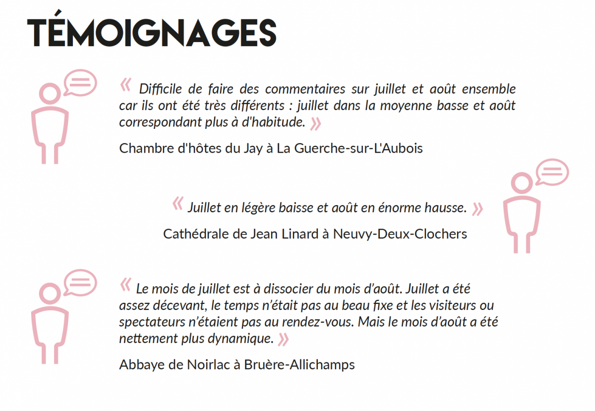 Source : La majorité des données présentées dans ce dossier proviennent de l’enquête réalisée en partenariat avec le Comité Régional de Tourisme Centre-Val de Loire réalisée du 27 août au 2 septembre 2024 auprès de 4 655 professionnels touristiques (hébergements, restaurants, monuments, sites, musées…). Elle a pour objectif de suivre l’activité touristique régionale. On compte pour le département du Cher, 121 répondants représentant 14% des répondants de la Région (851).