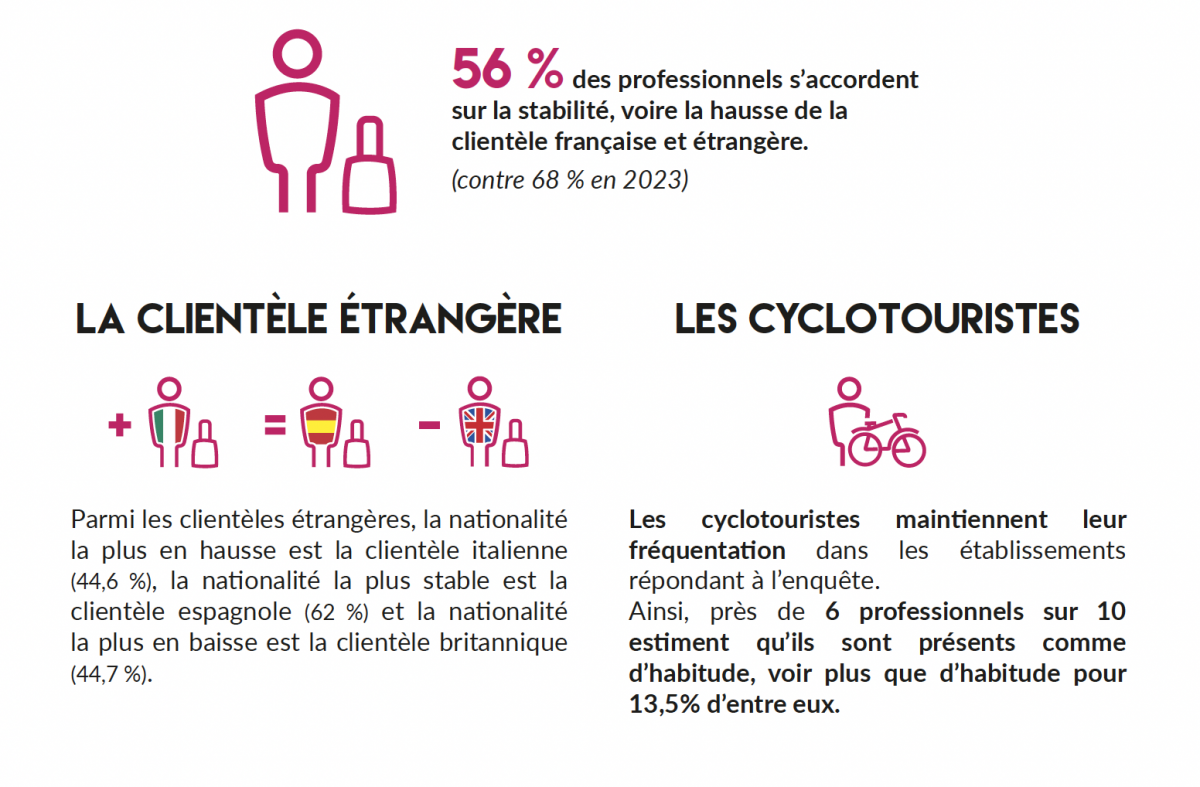 Les conditions météorologiques mitigées, le contexte politique particulier, la non-possibilité de réaliser un week-end prolongé lors du 14 juillet, comme cela avait pu être le cas en 2023, et pour finir, un pouvoir d’achat limité, a obligé les touristes, particulièrement français, à réaliser des arbitrages financiers. En ce qui concerne les clientèles étrangères, on note des belles performances sur les marchés italiens, belges et néerlandais mais une moindre présence des clientèles britanniques.