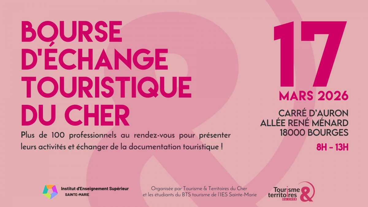 Cette année encore, l’Agence Tourisme & Territoires du Cher organise la Bourse d’Échange Touristique du Cher , en partenariat avec le BTS tourisme de l’IES Sainte-Marie. Elle aura lieu à Bourges, le mardi 17 mars 2026 au Carré d’Auron, de 8h à 13h, avec une ouverture au public à 9h.